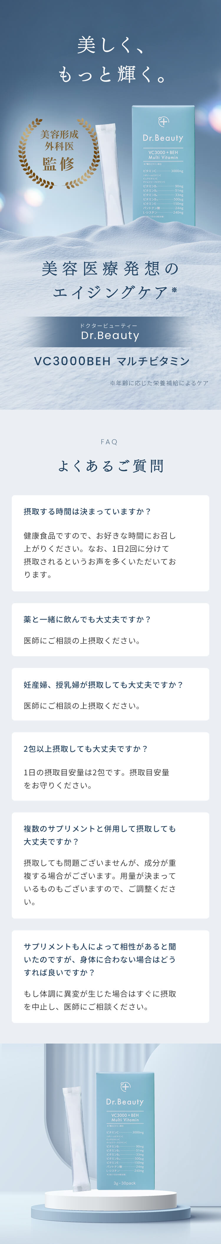 特徴 | 01:医療発想のビタミン処方設計 02:独自の高吸収×持続型ビタミンC 03:ビタミン・栄養素の吸収アップ 04:こだわりの剤形 従来のビタミンCサプリメントの課題を解決し、理想の効果を実現する革新的な製品です。 リポソーム化ビタミンC、タイムリリースビタミンCなどを独自の処方設計で配合することで、高い吸収率と吸収持続性を両立しました。 さらに、美容と健康に必要な美容医療機関でも処方されるビタミン・栄養素を配合したマルチビタミンサプリメントです。 |