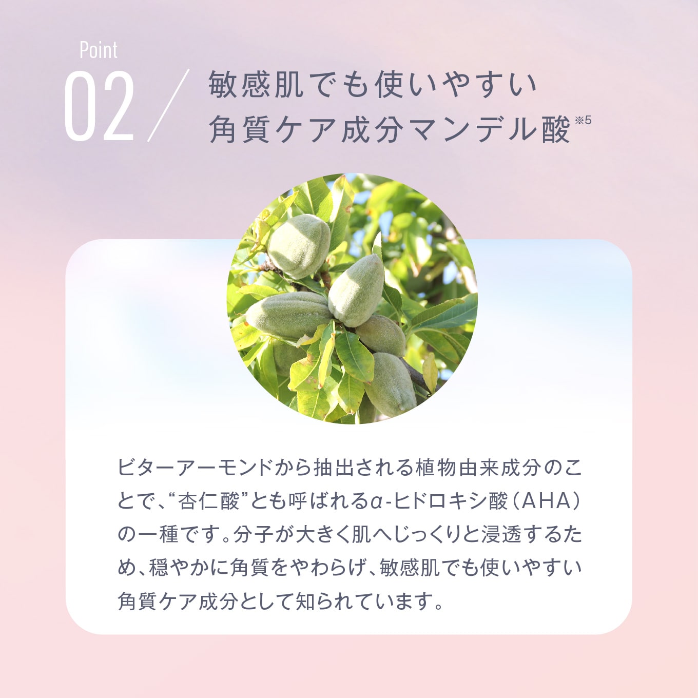 | 成分 | 水、ペンチレングリコール、BG、ナイアシンアミド、パンテノール、アゼロイルジグリシンK、グリシルグリシン、グリチルリチン酸2K、(アスコルビル/トコフェリル)リン酸K、セバシン酸、10-ヒドロキシデカン酸、1,10-デカンジオール、アラントイン、テトラヘキシルデカン酸アスコルビル、トロメタミン、マンデル酸、DPG、PEG-32、PEG-75、EDTA-2Na、PPG-6デシルテトラデセス-30、エクオール、PEG-60水添ヒマシ油、クエン酸、クエン酸Na、フェノキシエタノール、1,2-ヘキサンジオール |