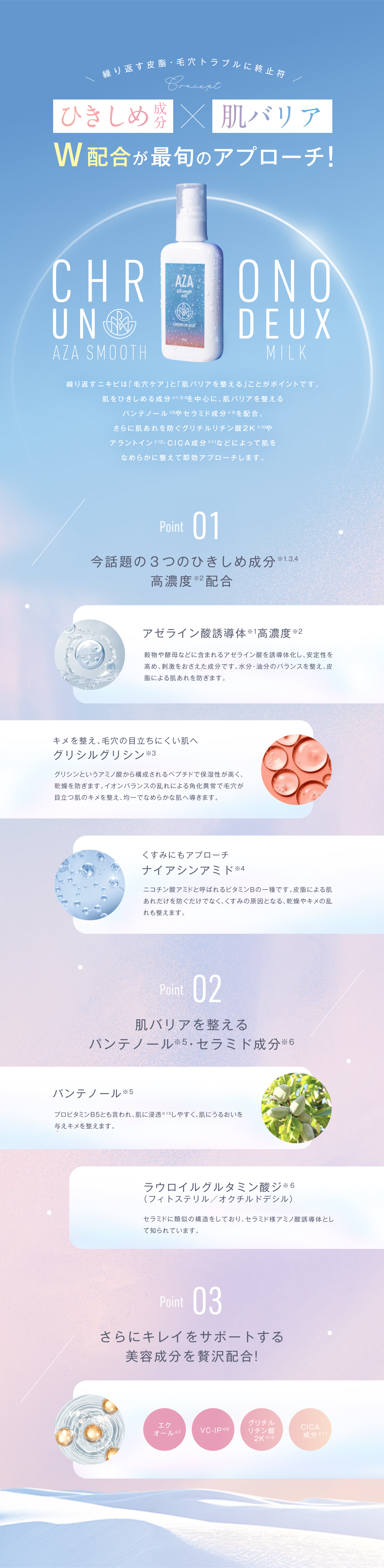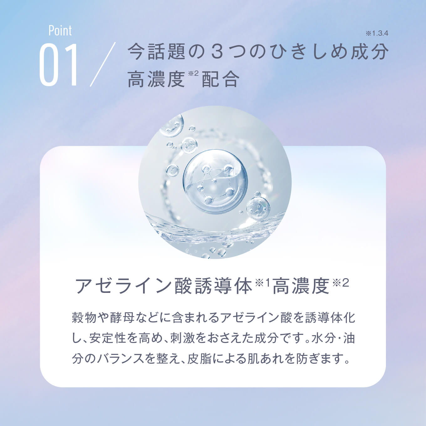 美容クリニックの最前線をホームケアに。 皮脂や毛穴トラブルが気になる肌に、ひきしめ成分を中心に肌バリアを整える乳液です。高濃度※2アゼライン酸誘導体※1をはじめとする3つのひきしめ成分アゼライン酸誘導体※1、グリシルグリシン※3、ナイアシンアミド※4が肌の油分・水分のバランスを整えながら、肌をひきしめて、毛穴の目立ちにくいなめらかな肌へ整えます。肌荒れを抑えつつ、セラミド成分※5が肌バリアを整えることでなめらかな肌へと導きます。 ※1 アゼロイルジグリシンK、水(整肌成分)、※2 取り使い製品比において、※3 グリシルグリシン(整肌成分)、※4 ナイアシンアミド(整肌成分)、※5 ラウロイルグルタミン酸ジ(フィトステリル/オクチルドデシル)(整肌成分) |