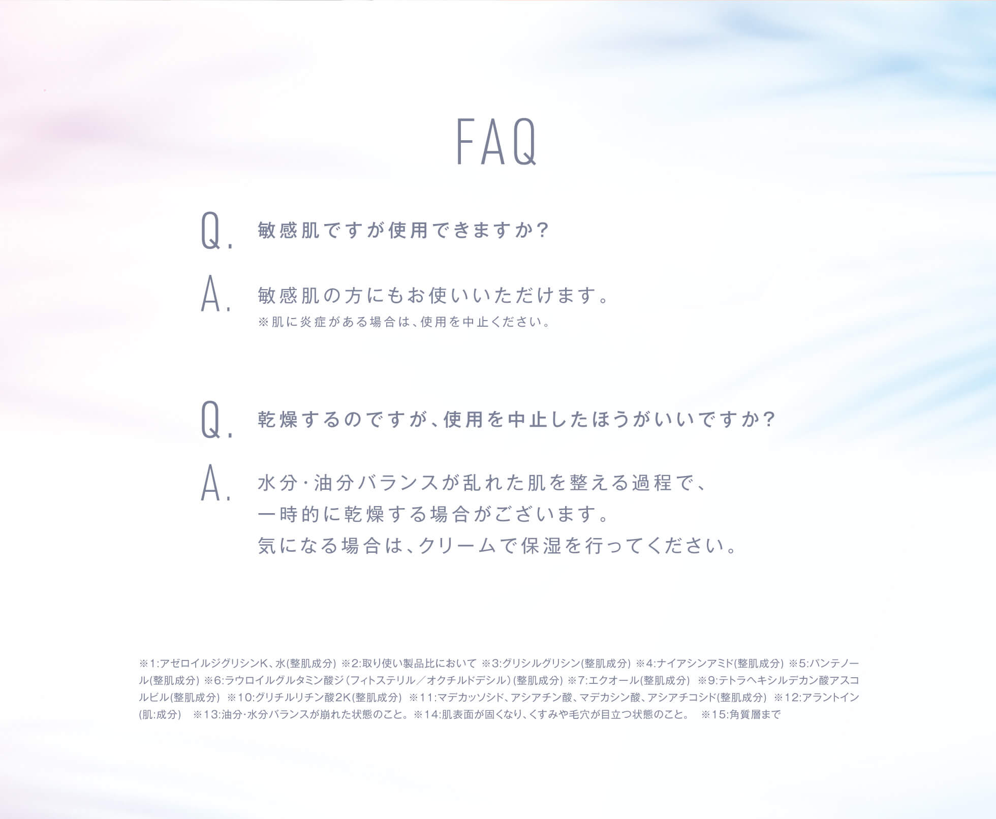 | ご使用上の注意 | 1.お肌に異常が生じていないかよく注意して使用してください。 化粧品がお肌に合わないとき即ち次のような場合には、使用を中止してください。 そのまま化粧品類の使用を続けますと、症状を悪化させることがありますので、皮膚科専門医等にご相談されることをおすすめします。 (1)使用中、赤味、はれ、かゆみ、刺激、色抜け(白斑等)や黒ずみ等の異常があらわれた場合 (2)使用したお肌に、直接日光があたって上記のような異常があらわれた場合 2. 傷やはれもの、しっしん等、異常のある部位にはお使いにならないでください。 3.目に入らないようご注意ください。目に入った場合はこすらず、すぐに水で洗い流してください。 |